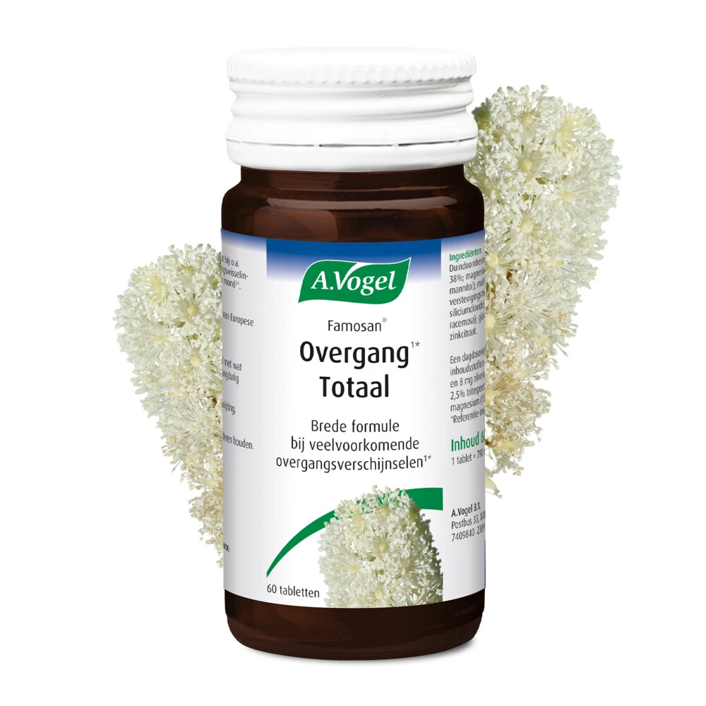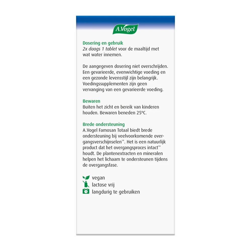 Vogel Famosan Overgang bij Stemmingswisselingen1*Famosan Totaal Stemmingswisselingen1* van A.Vogel is een krachtige formule voor vrouwen in de overgang. Deze krachtige formule heette voorheen Famosan Totaal. Famosan Famosan Stemmingswisselingen 1* geeft een brede ondersteuning bij meerdere overgangsverschijnselen1*. Naast stemmingswisselingen helpt het ook bij opvliegers, nachtzweten en de lichamelijke overgangsverschijnselen zoals een droge huid, ogen, mond, vagina2* en vermoeidheid3*. Cim