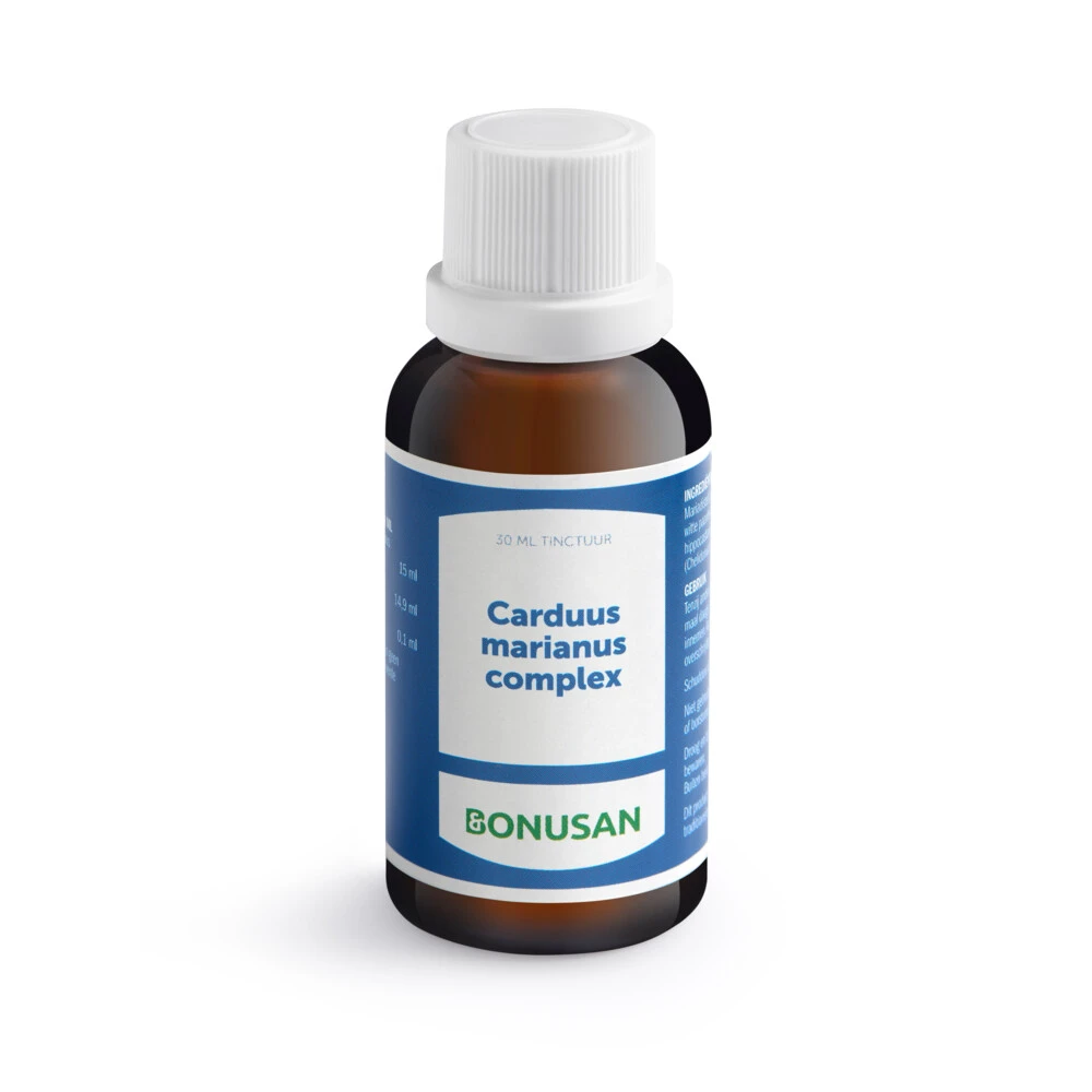 Bonusan Carduus Marianus ComplexCarduus marianus of Silybum marianus (mariadistel) staat de laatste jaren sterk in de wetenschappelijke belangstelling, onder andere vanwege zijn inhoudsstof silymarine.Dit is een kruidenpreparaat. Samenstelling per 30 ml: Chelidonium majus (stinkende gouwe) rhizoma 0,1 ml Aesculus hippocastanum (witte paardenkastanje) semen 14,9 ml ​Silybum marianum (mariadistel) fructus 15 ml alcoholgehalte 58% (v/v)