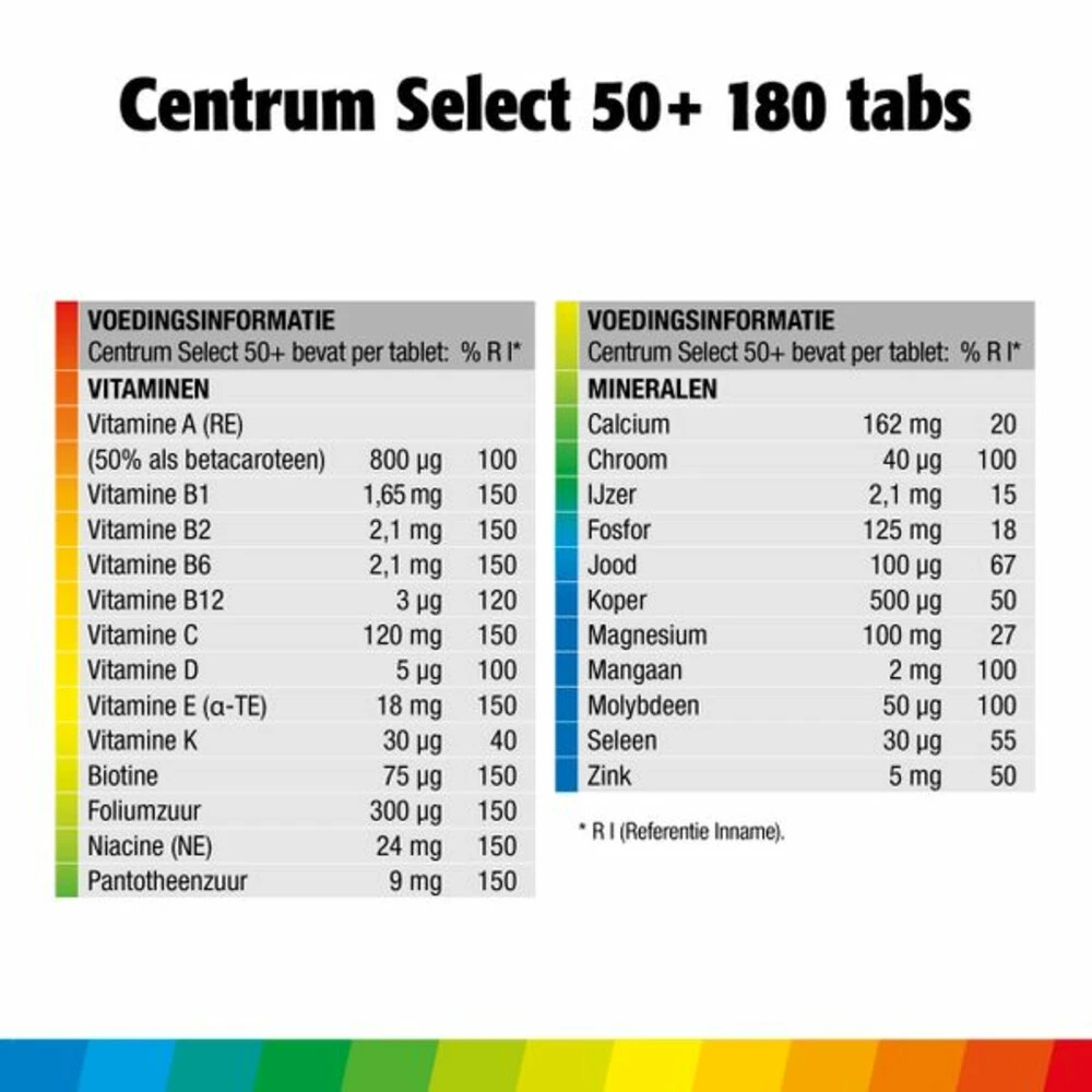 Centrum Select 50+ voor volwassenen vanaf 50 jaarCentrum Select 50+ is een complete A tot Z multivitamine die speciaal is ontwikkeld om de voedingsbehoeften van mannen en vrouwen vanaf 50 jaar te ondersteunen. Hoewel de energiebehoeften van het lichaam met de leeftijd afnemen, is een adequate inname van micronutriënten die uw lichaam nodig heeft, wenselijk. Die zijn immers heel belangrijk om een gevoel van welzijn en algemene fitheid te behouden.Centrum Select 50+ levert belangrijke voeding