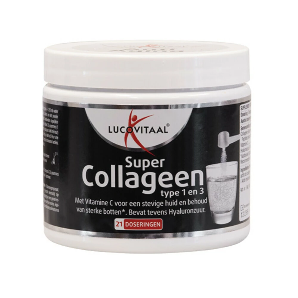 Lucovitaal Super Collageen Beauty PoederCollageen Beauty poeder van Lucovitaal is gemaakt voor volwassenen. Het bevat vitamine C dat bij draagt aan de vorming van collageen en helpt om de huid (van binnenuit) te verstevigen. Voor het behoud van sterke tanden en botten.Collageen is een lichaamseigen eiwit en een belangrijk bestanddeel van ons bindweefsel. Kraakbeen, botten, pezen, huid en tanden bestaan grotendeels uit collageen. Het lichaamseigen collageen behoudt de stevigheid en elasticiteit v