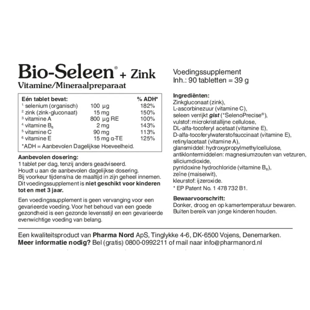 Pharma Nord Bio Seleen & Zink Bio-Seleen+Zink is een uitgebalanceerd antioxidantencomplex dat niet alleen zuivere, organisch gebonden selenium en zink bevat, maar ook de vitaminen, A, C, E en B6 die elk eigenschappen hebben die bijdragen aan de bescherming van DNA, eiwitten en lipiden tegen oxidatieve stress. Pure, organisch gebonden seleniumgist (SelenoPrecise), zink en de vitaminen A, B6, C en E.Uitgebalanceerd antioxidantencomplexNormale collageen aanmaak voor goed functioneren
