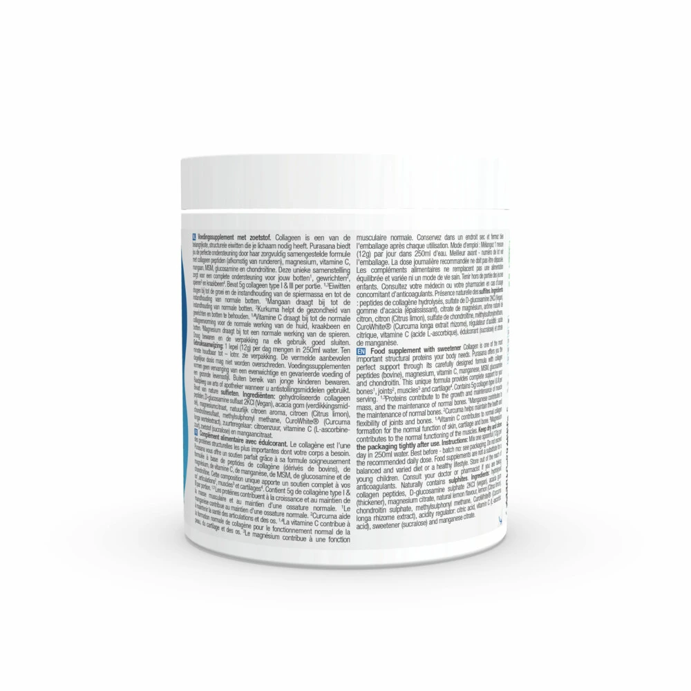 Purasana Joint Collageen CitroenPurasana Joint Collageen Citroen is een voedingssupplement bestaande uit een zorgvuldig samengestelde formule met collageen peptiden afkomstig van runderen, magnesium, vitamine C mangaan, MSM, glucosamine en chondroïtine. Deze bijzondere samenstelling biedt ondersteuning voor botten, gewrichten, spieren en kraakbeen*. Collageen is een van de meest essentiële, structuele eiwitten die het lichaam nodig heeft. Dit voedingssupplement in poedervorm is gemakke